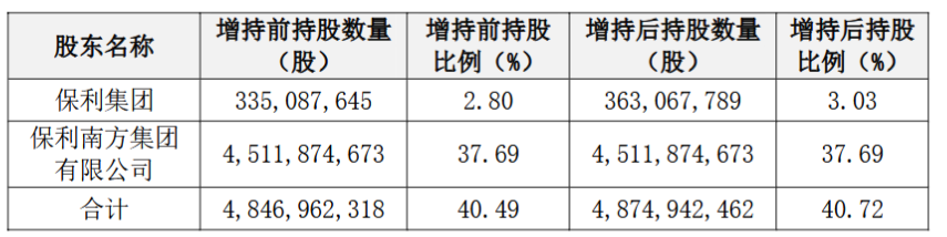 本次增持计划实施前,保利集团直接持有保利发展股份约3.35亿股,约占公司总股本的2.80%;与其全资子公司保利南方集团有限公司(公司控股股东)合计持有公司股份约为484,696万股,约占公司总股本的40.49%。本次增持计划实施完毕后,保利集团直接持有公司股份约为36,306万股,约占公司总股本的3.03%;与保利南方集团有限公司合计持有公司股份487,494万股,约占公司总股本的40.72%。