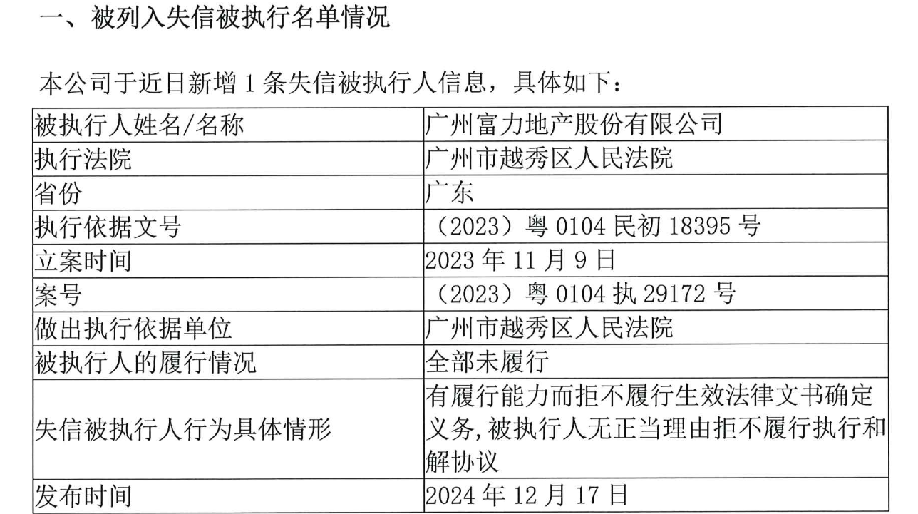 大公房产讯 近日,广州富力地产股份有限公司(以下简称“富力地产”)新增一条失信被执行人记录。据了解,富力地产因公司有履行能力而拒不履行生效法律文书确定义务,以及在无正当理由拒不履行执行和解协议,广州市越秀区人民法院将其列入失信被执行人名单。