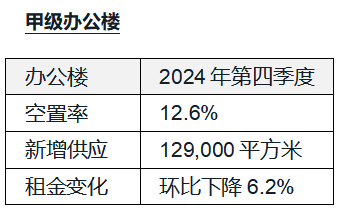 市场空置率仍面临上行挑战。四季度,丽泽子市场录得国家金融信息大厦入市,加剧了区域内资源竞争。该项目总建筑面积近13万平方米,现有去化主要来自于业主及其关联企业的办公需求。同时,第三使馆区、东长安子市场空置压力加速蔓延,企业缩租、退租行为存续。截至2024年底,北京甲级办公楼空置率环比上升0.7个百分点至12.6%。