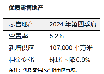 供应压力显现,空置率持续攀升。第四季度全市共有五个新项目入市,新增供应62.8万平方米,其中52.1万平方米集中在郊区市场。2024年,北京零售地产市场新增供应量达到162万平方米,创历史新高,市场竞争日益激烈。在供应扩容且需求放缓的市场格局下,新增空置面积的去化周期有所延长。市区空置率承压上升0.4个百分点,达到5.2%;而郊区空置率则上升1.3个百分点,录得9.0%,创下七个季度以来的新高。