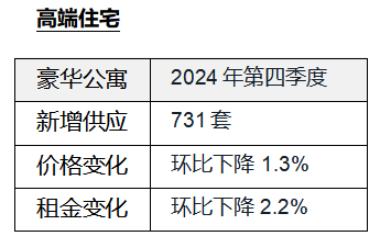 办公楼市场年末需求仍以搬迁和续租为主,加大租金让步幅度换取出租率成为大部分业主的共识。尽管租赁市场承压,北京的投资市场维持活跃,全年成交总额427亿元,办公楼仍为最主要成交类别。零售地产市场全年新增供应量达到162万平方米,创历史新高。但随着租赁需求放缓,新入市项目去化周期延长,整体市场竞争力度明显加大。在工业物流市场,由于租金持续下降刺激,四季度部分低标仓租户抓住窗口期进行品质升级,搬迁至高标仓。高端酒店市场在2024下半年表现稳定,与2023年同期相比呈现平稳上涨态势。高端住宅市场在楼市新政利好下,整体需求有所回暖,二手房价格降幅较三季度明显收窄。