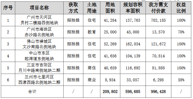 在权益比例方面,保利发展在广州市海珠区赤沙路北侧地块的权益比例为70%,兰州市七里河区西津西路北侧地块二期的权益比例为58%,广州市天河区员村二横路西侧地块、佛山市禅城区文沙南路北侧地块、中山市东区起湾道东侧地块以及三亚市吉阳区月川中路南侧地块二期的权益比例均为100%。