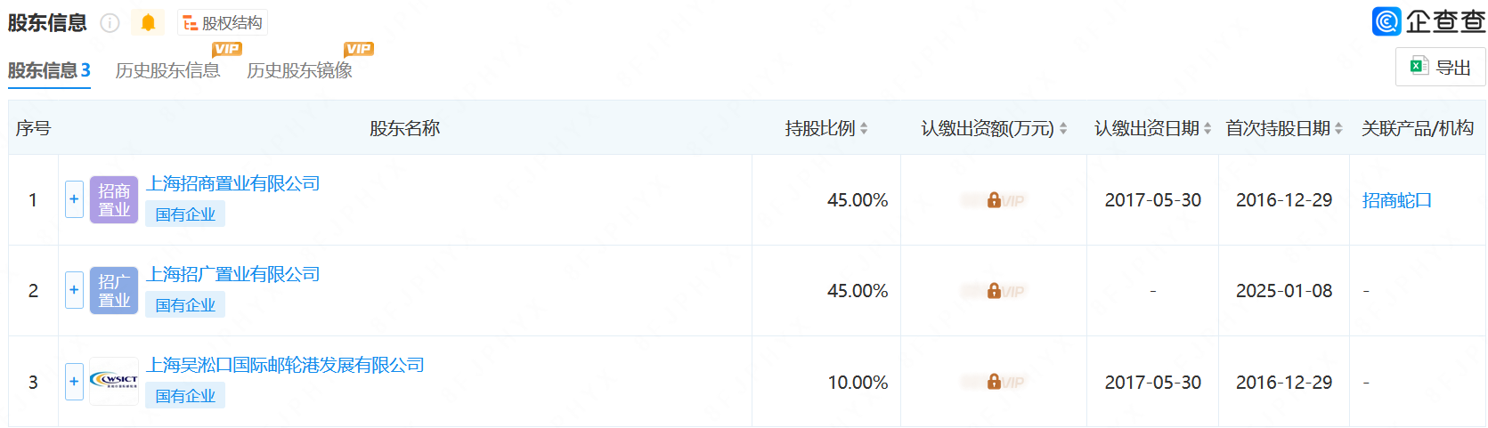 据了解,江瀚房地产成立于2016年8月,法定代表人为郭绍军,经营范围包括房地产开发经营、住宿服务、餐饮服务、食品销售等。现由上海招商置业有限公司(以下简称“招商置业”)、招广置业、上海吴淞口国际邮轮港发展有限公司(以下简称“吴淞口国际邮轮港”)共同持股,分别持有其45%、45%、10%的股权。