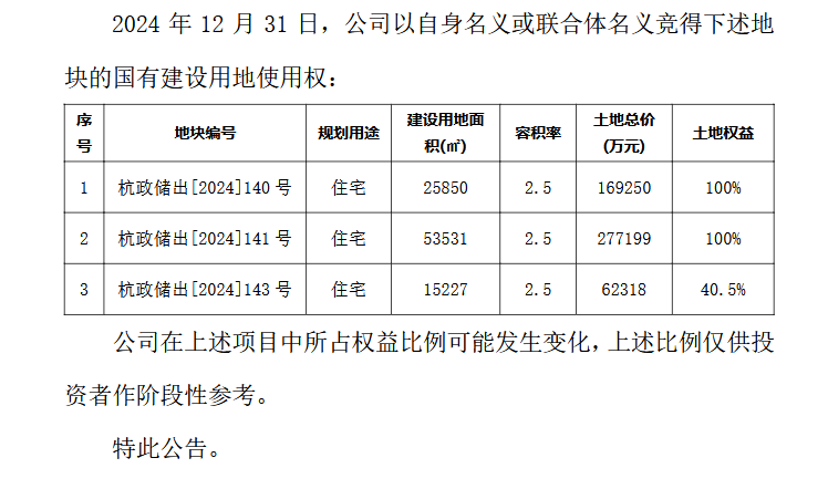 据了解,2025年1月2日公告显示,滨江集团于2024年12月31日以自身名义或联合体名义竞得杭政储出[2024]140、141以及143号三宗地块的国有建设用地使用权。具体来看,杭政储出[2024]143号地块规划为住宅,建设用地面积约为15227平方米,容积率为2.5,土地总价约为6.23亿元,滨江集团的土地使用权益为40.5%。