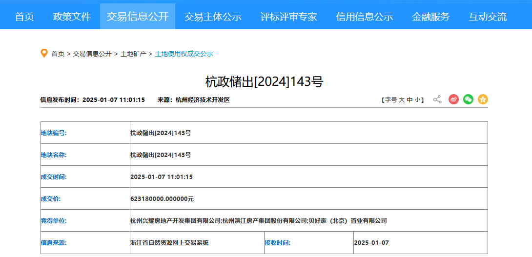 浙江省公共资源交易中心显示,该地块竞得单位为杭州兴耀房地产开发集团有限公司、滨江集团、贝好家(北京)置业有限公司。