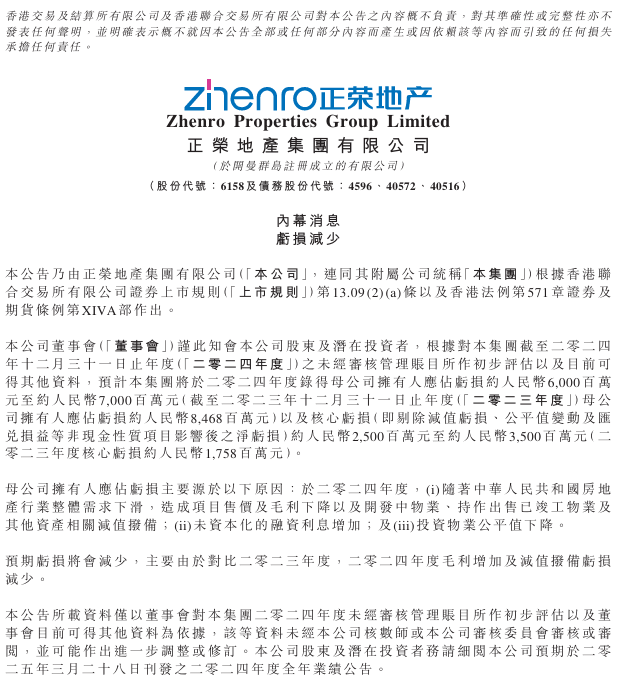 对于年度预期亏损将会减少,正荣地产解释称,主要由于对比2023年度,2024年度毛利增加及减值拨备亏损减少。