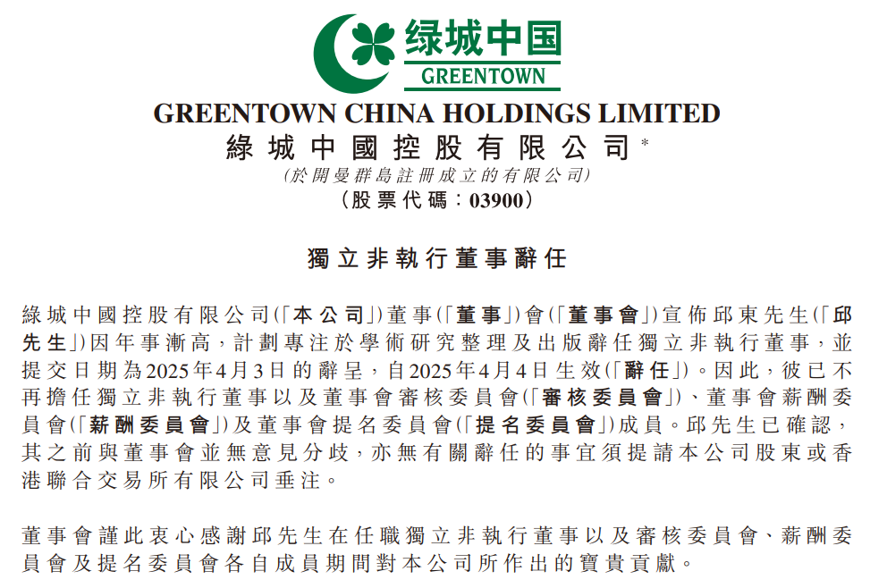 绿城中国方面表示,为确保公司治理结构的完整性和有效性,将计划在合理可行的情况下尽快任命合适的候选人担任独立非执行董事职位。