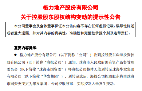 大公房产讯 近日,格力地产股份有限公司(以下简称“格力地产”)发布关于控股股东股权结构变动的提示性公告。