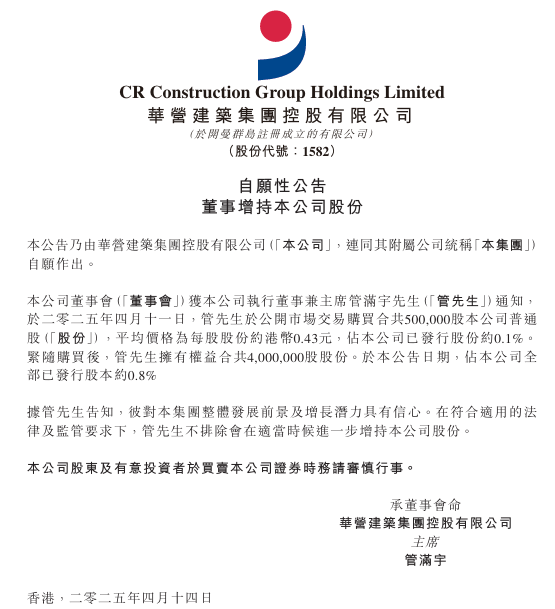 大公房产讯 据港交所披露文件,4月14日,华营建筑集团控股有限公司(以下简称“华营建筑”)发布公告,宣布公司执行董事兼主席管满宇通过公开市场增持50万股公司股份,交易均价为每股0.43港元,总耗资约21.5万港元。