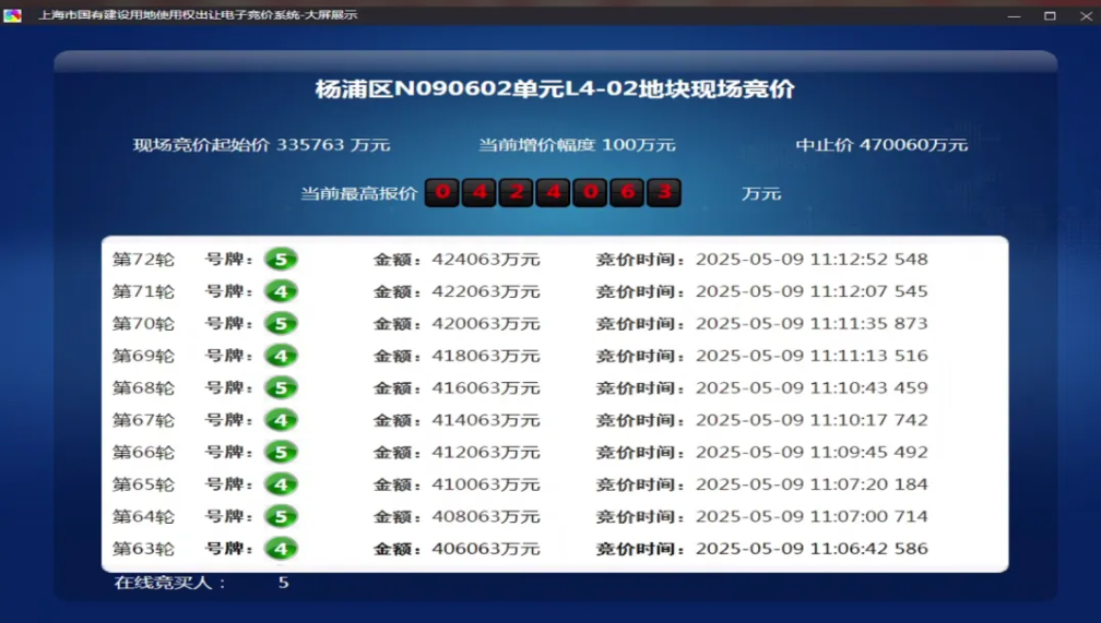 另外一宗地块,即杨浦区N090602单元L4-02地块,是此次土拍成交价、溢价率最高的地块。据悉,该地块处于杨浦区东外滩,东至L4-11规划街坊通道,南至L4-11规划街坊通道西至定海路,北至L4-10规划绿地,出让面积约2.15万平方米,容积率为2.5。其吸引了招商蛇口、中国金茂、华润置地、中海地产、保利置业共5家竞买人参与竞价,经过72轮竞价,最终由保利置业旗下公司上海盛真置业有限公司约42.41亿元竞得,成交楼面价8.02万元/平方米,溢价率26.3%。