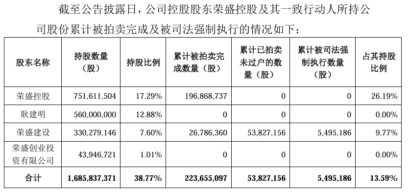 截至5月12日,荣盛发展控股股东荣盛控股及其一致行动人所持公司股份约16.86亿股,持股比例合计约为38.77%,累计被拍卖完成数约2.24亿股,累计已拍卖未过户的数量约5382.72万股,累计被司法强制执行数量约549.52万股,占其持股比例的13.59%。其中,荣盛建设持有的约549.52万股是因执行案件被法院通过非交易过户方式强制执行处置。