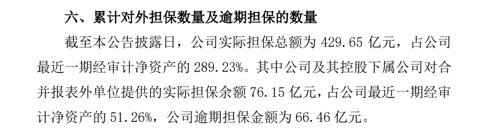 截至本公告披露日,荣盛发展实际担保总额为429.65亿元,占公司最近一期经审计净资产的289.23%。其中公司及其控股下属公司对合并报表外单位提供的实际担保余额76.15亿元,占公司最近一期经审计净资产的51.26%,公司逾期担保金额为66.46亿元。