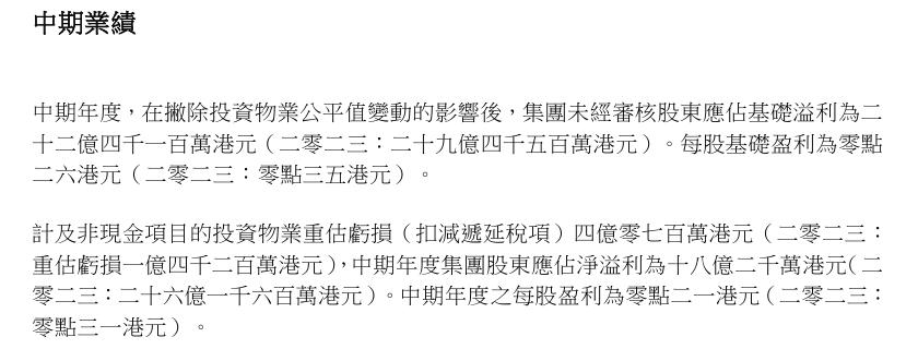 2月26日,信和置业发布截至2024年12月31日的中期业绩。业绩显示,集团未经审计的股东应占基数盈利为22.41亿港元,同比下降24%。每股基数盈利为0.26港元,同比下降25.7%。