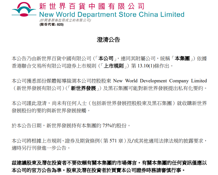 同日,新世界百货中国有限公司(股份代号:825,以下简称“新世界百货”)也发布公告称,公司获悉部分媒体报导揣测本公司控股股东 New World Development Company Limited(新世界发展)及黑石集团可能对新世界发展提出私有化要约。本公司谨此澄清,尚未有任何人士(包括新世界发展控股股东及黑石集团)就收购新世界发展股份的要约与新世界发展接触。