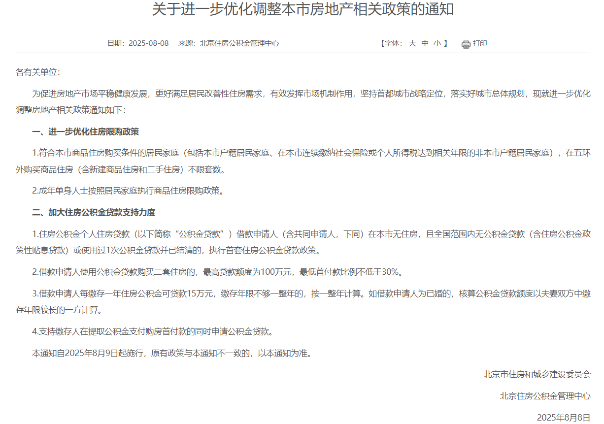 大公房产讯 8月8日,北京市住房和城乡建设委员会、北京住房公积金管理中心联合发布《关于进一步优化调整本市房地产相关政策的通知》(以下简称《通知》)。该《通知》自2025年8月9日起施行,原有政策与《通知》不一致的,以《通知》为准。