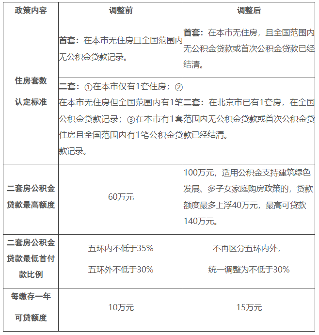 调整前,公积金贷款住房套数认定标准为:首套住房,在北京无住房且全国范围内无公积金贷款记录;二套住房,在北京仅有1套住房,或在北京无住房但全国范围内有1笔公积金贷款记录,或在北京有1套住房且全国范围内有1笔公积金贷款记录。