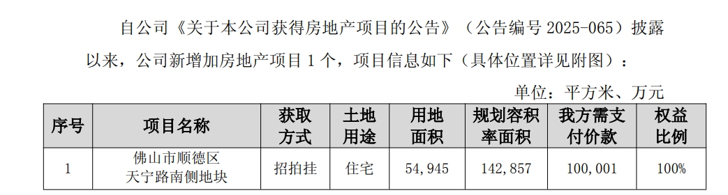 拿地方面,自2025年6月5日公布公司获得房地产项目的公告以来,保利发展通过招拍挂新增加1个房地产项目。该项目为佛山市顺德区天宁路南侧地块,土地用途为住宅,用地面积54945平方米,规划容积率面积142857平方米,保利发展需支付价款约10亿元,权益比例为100%。
