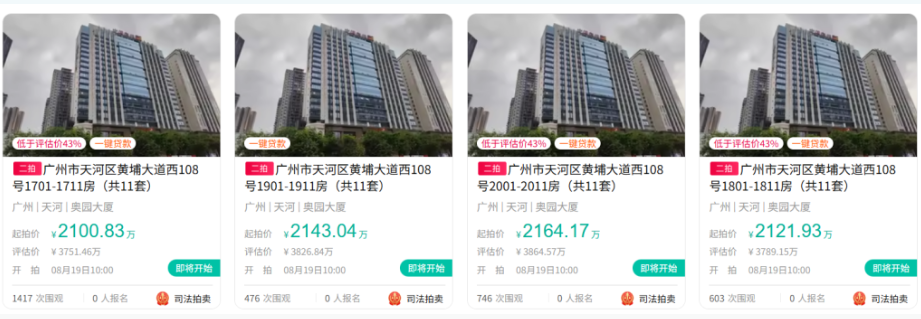 大公房产讯 8月15日,据阿里资产网显示,中国奥园集团股份有限公司(以下简称“奥园集团”)广州总部44套房产被司法拍卖。