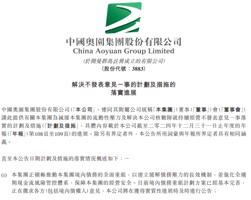 2025年7月4日,奥园集团发公告称,集团正积极推动本集团境内债务的全面重组,以建立缓解债务压力的长效机制,并强化全周期现金流风险管控体系,保障本集团的经营安全。目前境内债务重组计划方案已经基本完善,正在征求各方包括境内债权人意见,公司将在获得实质性进展时及时进行公告。