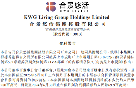 根据公告,基于初步评估,合景悠活及其附属公司(统称“集团”)预期今年上半年将录得亏损净额不多于约2.8亿元,而截至2024年6月30日止六个月则为利润净额约6990万元。