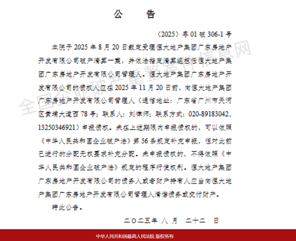 据广州中法在全国企业破产重整案件信息网上刊登的法律文书显示,恒大地产广东公司的债权人须在2025年11月20日前向管理人申报债权;未在期限内申报的,可依《企业破产法》第56条规定补充申报,但对此前分配无权要求补充分配。文书同时确认该公司已依法进入破产程序并由清算组担任管理人。