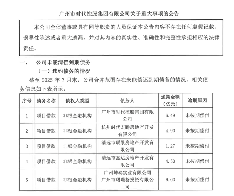 截至2025年7月末,广州时代控股合并范围存在未能偿还到期债务约86.87亿元,其中涉及项目借款、商票。