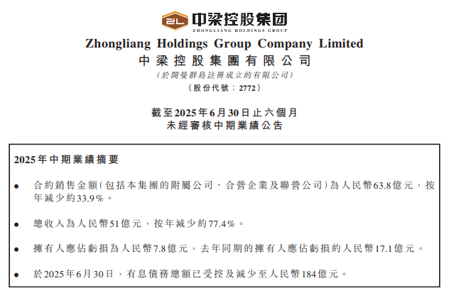 大公房产讯 8月27日,中梁控股集团有限公司(以下简称“中梁控股”)发布截至2025年6月30日止六个月未经审核中期业绩报告。报告显示,期内中梁控股实现营业总收入约51亿元,同比下降约77.4%;拥有人应占亏损为7.8亿元,去年同期的拥有人应占亏损约17.1亿元。