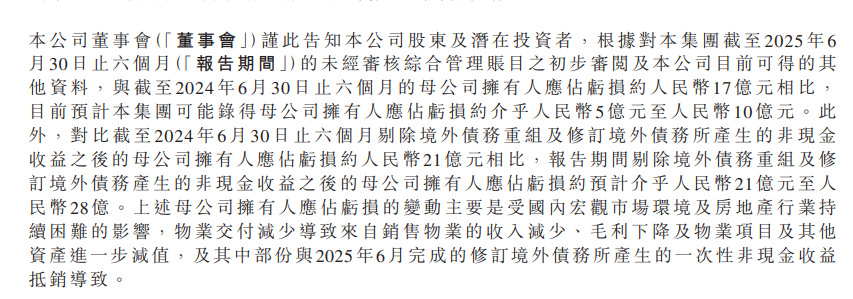 对于拥有人应占亏损,中梁控股曾在8月22的盈利警告中解释称,主要是受国内宏观市场环境及房地产行业持续困难的影响,物业交付减少导致来自销售物业的收入减少、毛利下降及物业项目及其他资产进一步减值,及其中部份与2025年6月完成的修订境外债务所产生的一次性非现金收益抵销导致。
