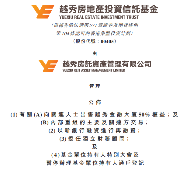 大公房产讯 9月8日,越秀房地产投资信托基金(以下简称“越秀房产基金”)发布公告,宣布计划出售旗下越秀金融大厦50%股权权益,并同步启动公司内部重组及债务再融资。