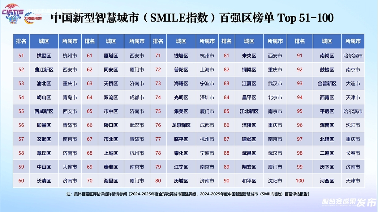 在《2024-2025年度中国新型智慧城市(SMILE指数)百强区》榜单中,北京市海淀区、深圳市南山区、上海市浦东新区、广州市黄埔区、北京市朝阳区、上海市闵行区、深圳市罗湖区、北京市西城区、上海市徐汇区、重庆市两江新区位列前十名。
