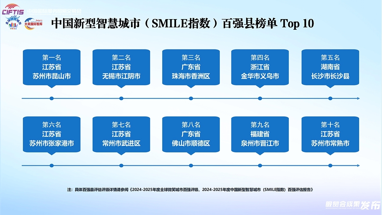 在《2024-2025年度中国新型智慧城市(SMILE指数)百强县》榜单中苏州市昆山市、无锡市江阴市、珠海市香洲区、金华市义乌市、长沙市长沙县、苏州市张家港市、常州市武进区、佛山市顺德区、泉州市晋江市、苏州市常熟市位列区县级前十名,成为全国新型智慧县城发展典范。