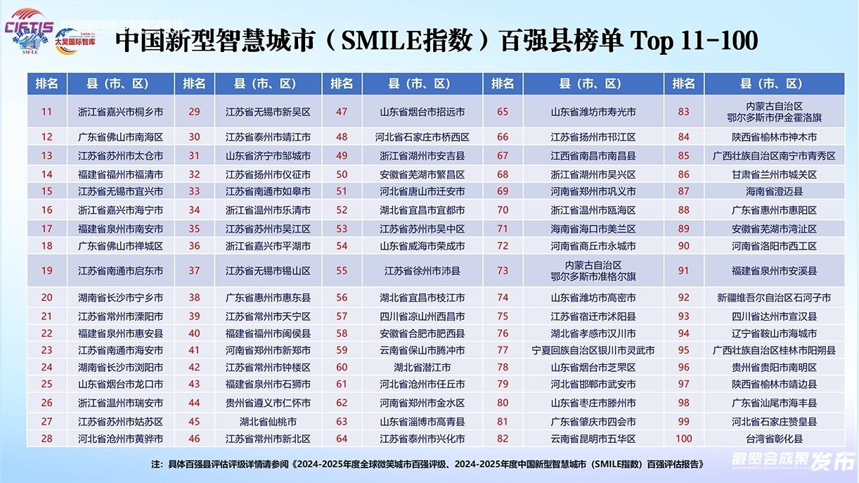 全球微笑城市(SMILE指数)副主任委员、原华为智慧城市首席科学家郑志彬博士正式公布了2024-2025年度中国新型智慧城市(SMILE指数)百强市、百强区以及百强县名单。