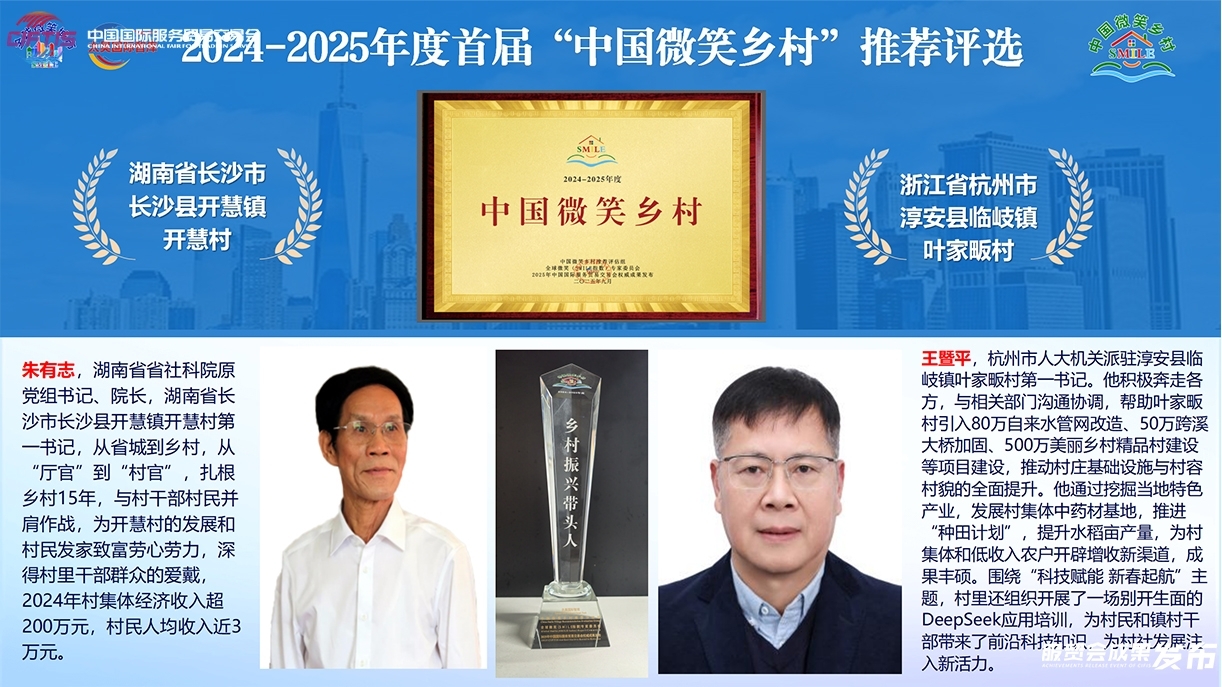 值得特别关注是第三大创新,今年首次把乡村建设纳入到SMILE指数评测范围,首次组织开展中国微笑乡村成果发布,湖南省长沙市长沙县开慧镇开慧村与村第一书记湖南省省社科院原党组书记、院长朱有志和浙江省杭州市淳安县临岐镇叶家畈村与杭州市人大机关派驻的村第一书记王暨平同志分别当选2024-2025年度首届中国微笑乡村和2024-2025年度首届中国微笑乡村振兴带头人荣誉。朱有志书记从“厅官”到“村官”,扎根乡村15年,为开慧村的发展和村民致富劳心劳力,深得村里干部群众的爱戴;王暨平书记帮助叶家畈村推动村庄基础设施与村容村貌的全面提升,尤其是围绕“科技赋能新春起航”主题,专门组织了别开生面的DeepSeek应用培训,为村社发展注入新活力。