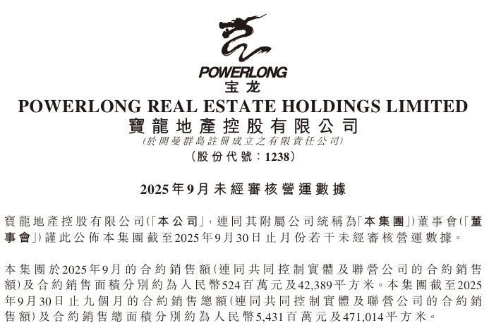 根据公告,宝龙地产连同其附属公司(以下统称“集团”)9月份的合约销售额(连同共同控制实体及联营公司的合约销售额)约为5.24亿元,同比下降14.7%;合约销售面积为4.24万平方米,同比下降18.4%。截至2025年9月30日止九个月,该集团的合约销售总额(连同共同控制实体及联营公司的合约销售额)约为54.31亿元,同比下降43.6%;合约销售总面积约为47.10万平方米,同比下降48.0%。