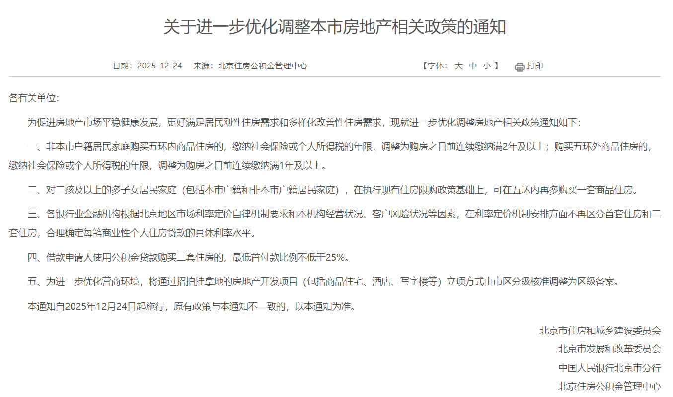 “北京2025年12月24日出台的《通知》,是继今年8月五环外限购松绑后,又一次精准调控。是落实‘十五五’相关精神,‘清理住房等消费不合理限制性措施’,以减少行政干预,释放消费潜力。既通过需求端松绑释放有效需求,又通过金融端减负降低购房成本,还通过供给端提效保障优质供给,形成精准调控、供需合力的效果,以推动北京楼市向高质量发展迈进。”58安居客研究院院长张波表示。