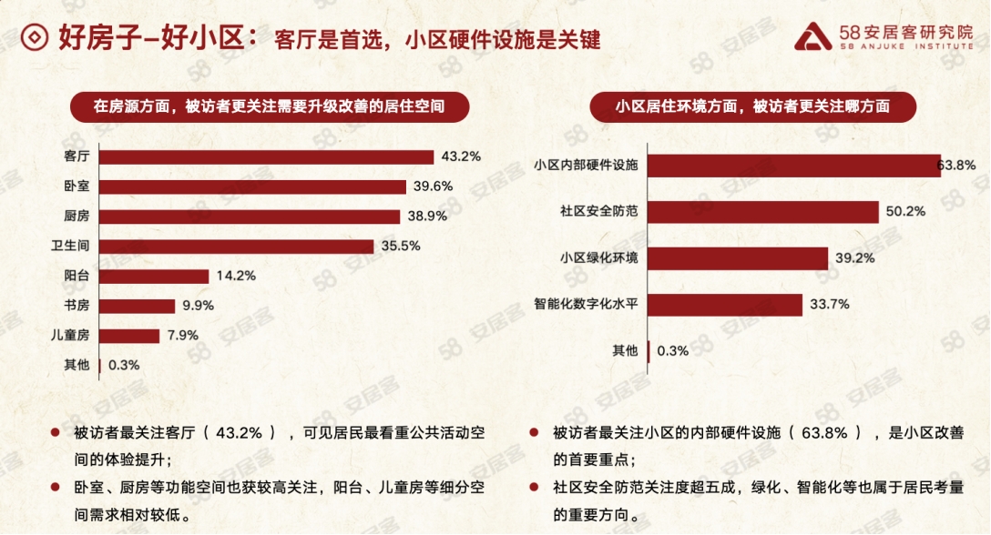在居住空间方面,58同城、安居客调研数据显示,43.2%的受访者更关注客厅空间的改善,高于卧室、厨房等功能区域。在小区的居住环境方面,小区车位不足问题较为突出。高达48.3%的受访者指出小区车位不足是首要痛点,公共空间和电动车管理问题紧随其后。