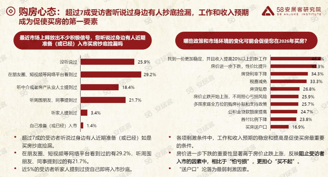 在入市的条件上,购房者的判断更为审慎。“工作与收入提升”“房价进一步下行”“房贷利率下降”被认为是影响2026年购房决策的三项关键因素。其中,选择“房价进一步下行”的比例为42.3%,显著高于选择“房价止跌回升”的25.9%,也反映出购房者在决策中,相较于“担心亏损”,更在意“是否还能负担得起”。