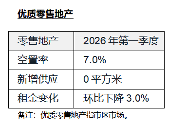 零售地产市场深度调整延续,需求支撑不足加剧租金下行压力。一季度,市区市场有效租金环比下降3.0%,同比跌幅扩大至10.4%。当前环境下,项目普遍难以同时兼顾租金稳定性、高入驻率与高端定位,有所取舍不可避免。仲量联行华北区研究部资深董事纪明表示:“技术变革对社会结构的冲击正加速传导至经济体系。由AI驱动的数字融合空间与数智产品的线下扩张,将深刻重塑未来消费生态。”