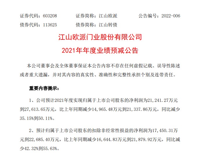大公房产讯 江山欧派(603208.SH)发布公告,公司预计2021年度实现归属于上市公司股东的净利润为2.12亿元到2.76亿元,同比减少35.15%到50.11%。