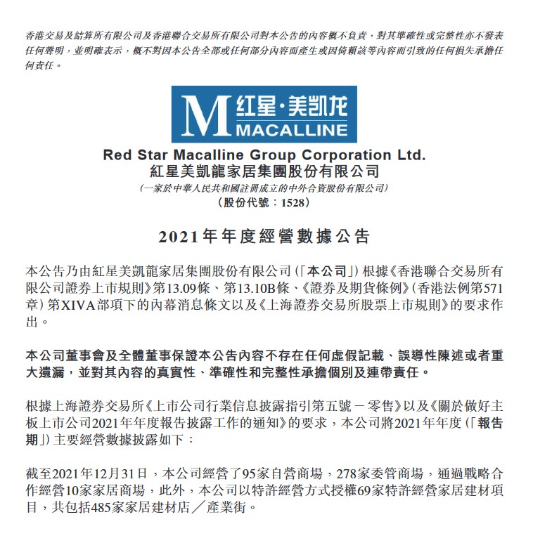 公告显示,报告期内,红星美凯龙自营商场净增加3家、委管商场新开业20家。截至2021年12月底,红星美凯龙共经营95家自营商场,278家委管商场,通过战略合作经营10家家居商场,以特许经营方式授权开业69家特许经营家居建材项目,共包括485家家居建材店/产业街。
