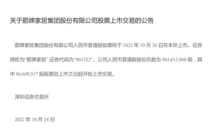 10月24日,箭牌家居集团股份有限公司(以下简称“箭牌家居”)发布了关于公司股票上市交易等相关公告。公告称,箭牌家居将于10月26日在深交所上市,简称为“箭牌家居”,证券代码为“001322”。公司人民币普通股股份总数为965,612,800股,其中96,609,517股股票自上市之日起,以12.68元/股开始上市交易。