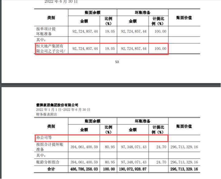 从2021年年末至2022年6月,恒大集团及其子公司/孙公司”(下文简称恒大系公司)的坏账名单进一步扩容,坏账金额余额从7789万元飙升至9272.48万元,且应收账款按照100%计提坏账。但是,根据公告,箭牌家居在面对账龄2年以上(截至2022年6月30日)应收账款1.13亿元时,也只计提了70%左右。