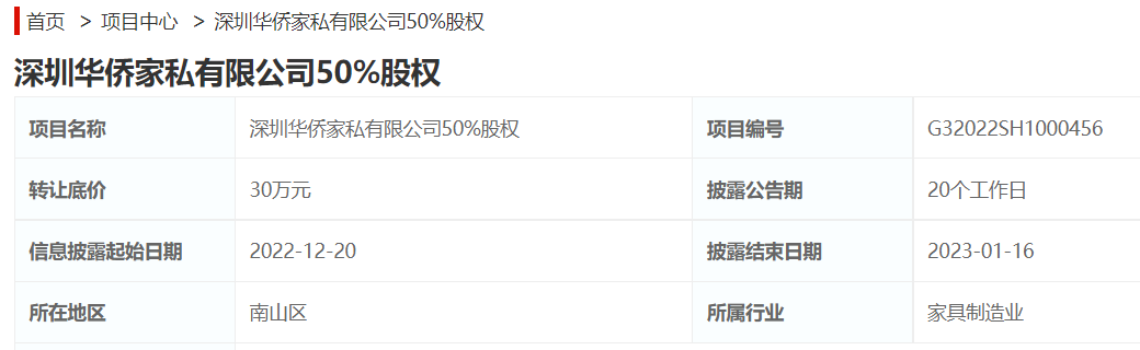大公房产讯 12月20日,根据全国产权行业信息化综合服务平台,华侨城集团有限公司拟以30万元底价转让深圳华侨家私有限公司(以下简称“华侨家私”)50%股权。