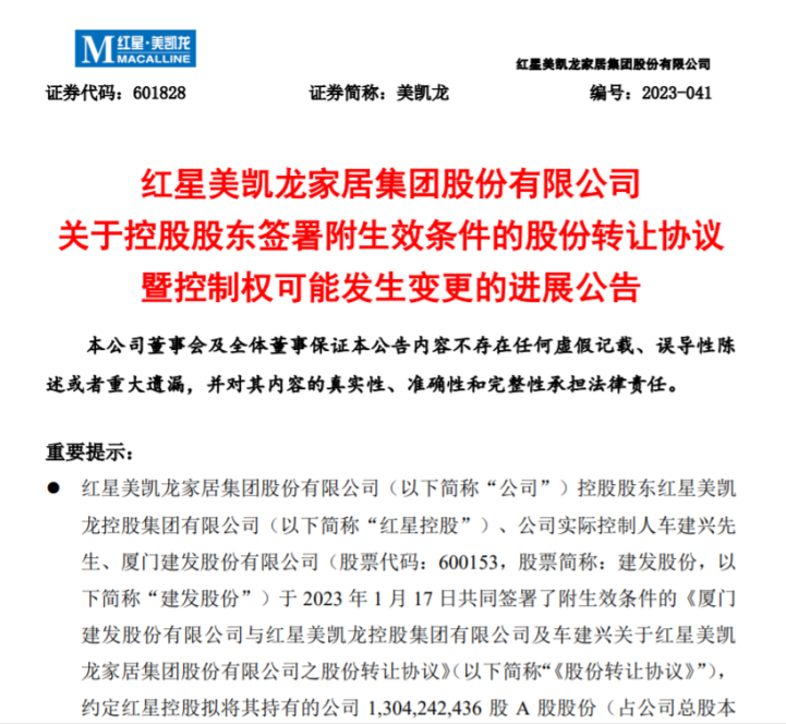据了解,美凯龙控股股东红星美凯龙控股集团有限公司(以下简称“红星控股”)、公司实际控制人车建兴先生、厦门建发股份有限公司以下简称“建发股份”)于2023年1月17日共同签署了附生效条件的《厦门建发股份有限公司与红星美凯龙控股集团有限公司及车建兴关于红星美凯龙家居集团股份有限公司之股份转让协议》,约定红星控股拟将其持有的公司约13.04亿股A股股份以4.82元/股的价格转让给建发股份。