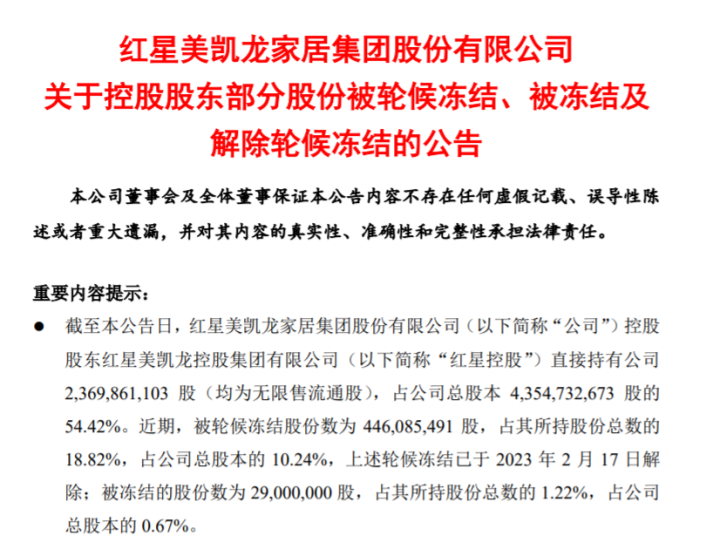 另据2月17日公告,红星控股直接持有美凯龙约23.7亿股,占公司总股本约43.55亿股的54.42%。近期,被轮候冻结股份数约为4.46亿股,占其所持股份总数的18.82%,占公司总股本的10.24%,相关轮候冻结已于2023年2月17日解除;被冻结的股份数为2900万股,占其所持股份总数的1.22%,占公司总股本的0.67%。