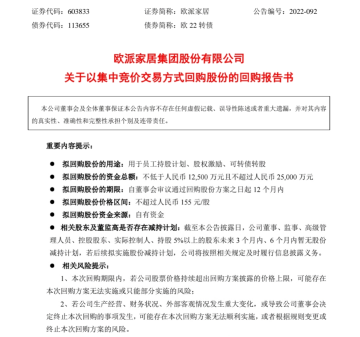 公告显示,2022年10月20日,欧派家居收到了公司控股股东、实控人、董事长姚良松《关于提议回购公司股份的函》。2022年10月27日,公司召开第四届董事会第二次会议,审议通过了《关于以集中竞价交易方式回购股份方案的议案》等议案,同意公司以总额不低于人民币1.25亿元(含)且不超过人民币2.5亿元(含)的自有资金以集中竞价交易方式回购公司股份,用于员工持股计划、股权激励、可转债转股。回购价格不超过人民币155元/股(含),回购期限自董事会审议通过之日起12个月内。
