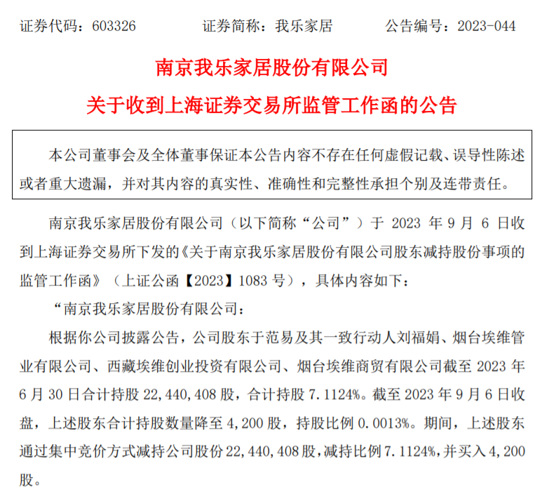 因此,上交所对我乐家居及相关股东提出两点监管要求。一是要求我乐家居立即同相关股东核实股份减持情况,并向我部回函中明确列示相关股东于上述时间区间内的股份交易及持股比例变动明细;同时,立即自查是否存在违反《证券法》《上市公司收购管理办法》相关规定的情形。二是请我乐家居董监高勤勉尽责,督促公司大股东认真学习相关规定,规范自身减持行为,充分保障上市公司及中小股东合法权益。