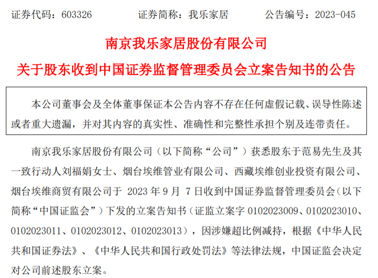 中国证监会在知悉上述减持情况后,向于范易及其一致行动人等下发立案告知书,其中提到,因涉嫌超比例减持,根据《中华人民共和国证券法》、《中华人民共和国行政处罚法》等法律法规,中国证监会决定对我乐家居相关股东立案。