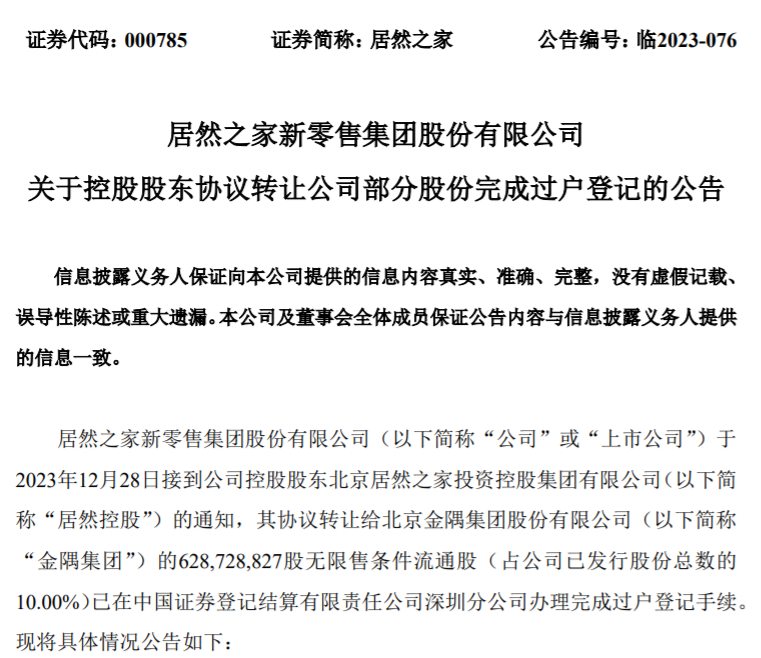 大公房产讯 12月29日,居然之家新零售集团股份有限公司(证券代码:000785,证券简称:居然之家)发布关于控股股东协议转让公司部分股份完成过户登记的公告。