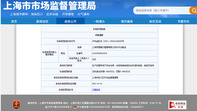 大公房产讯 10月21日,据企查查显示,上海奈雪餐饮管理有限公司东长治路店因生产经营其他不符合法律、法规或者食品安全标准的食品、食品添加剂,被上海市虹口区市场监督管理局罚款5000元并没收违法所得2500元。